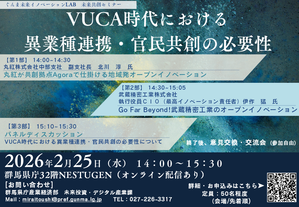 ぐんま未来イノベーションLAB主催 未来共創セミナー「VUCA時代における異業種連携・官民共創の必要性」 お申込フォーム<外部リンク>よりお願いいたします。