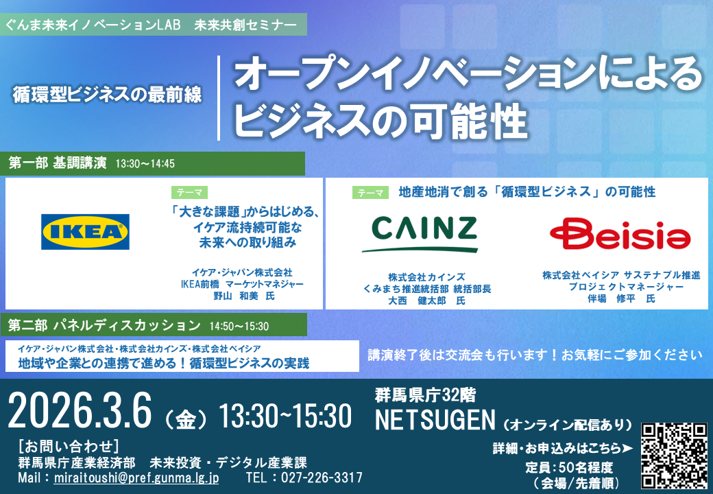 ぐんま未来イノベーションLAB主催 未来共創セミナー「循環型ビジネスの最前線:オープンイノベーションによるビジネスの可能性」お申込みフォーム<外部リンク>よりお願いいたします。